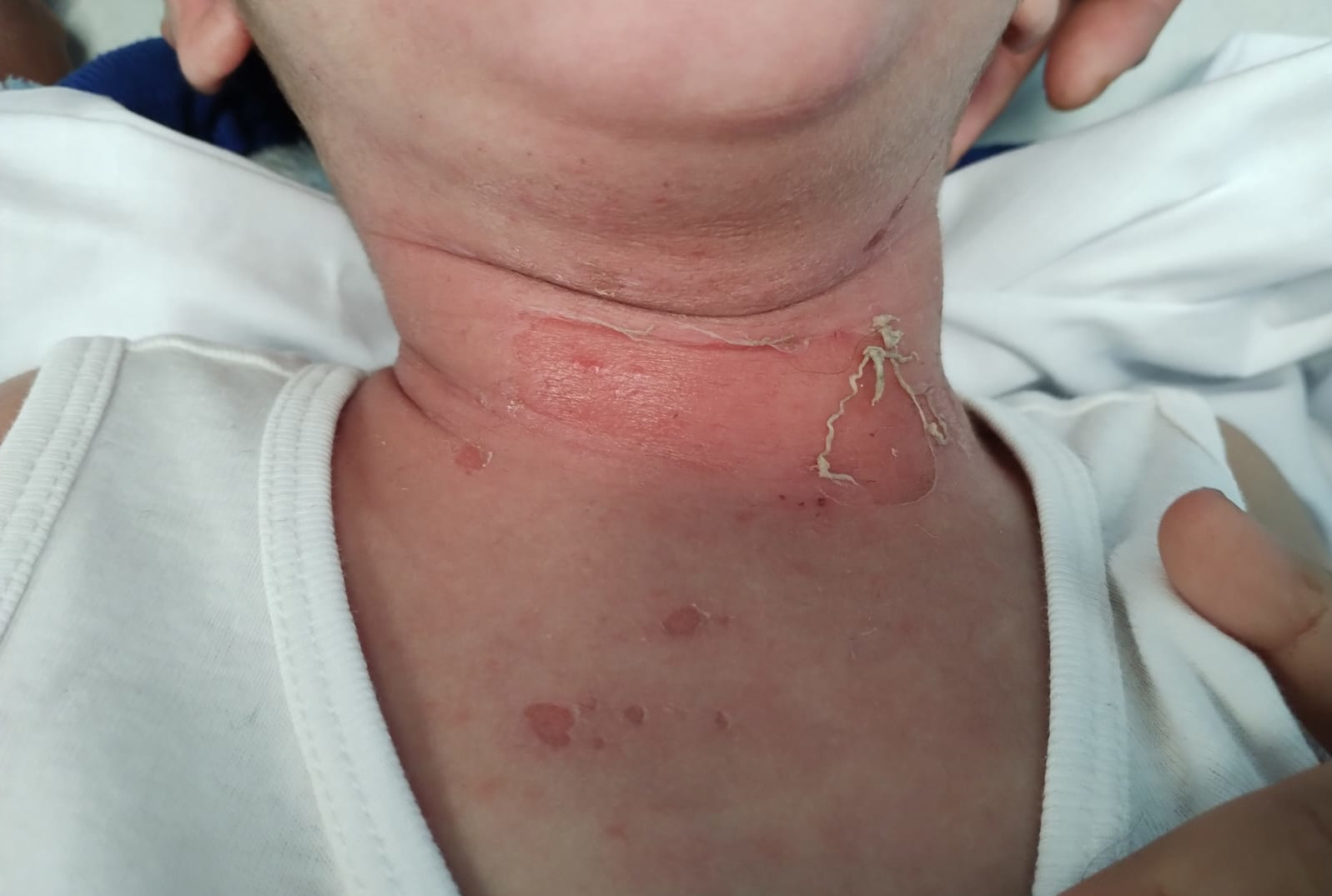 Niño de 2 años que consulta por fiebre junto con lesiones cutáneas descamativas periorales (Figura 1), en el cuello (Figura 2) y en la región perianal de 24 horas de evolución. Asocia dolor cutáneo. La madre refiere que el niño presentó un eritema cutáneo 24 horas antes de la aparición de las lesiones. No presenta afectación palmoplantar ni de mucosas. No toma de fármacos. Se realiza una analítica sanguínea con hemograma y bioquímica, sin alteraciones.