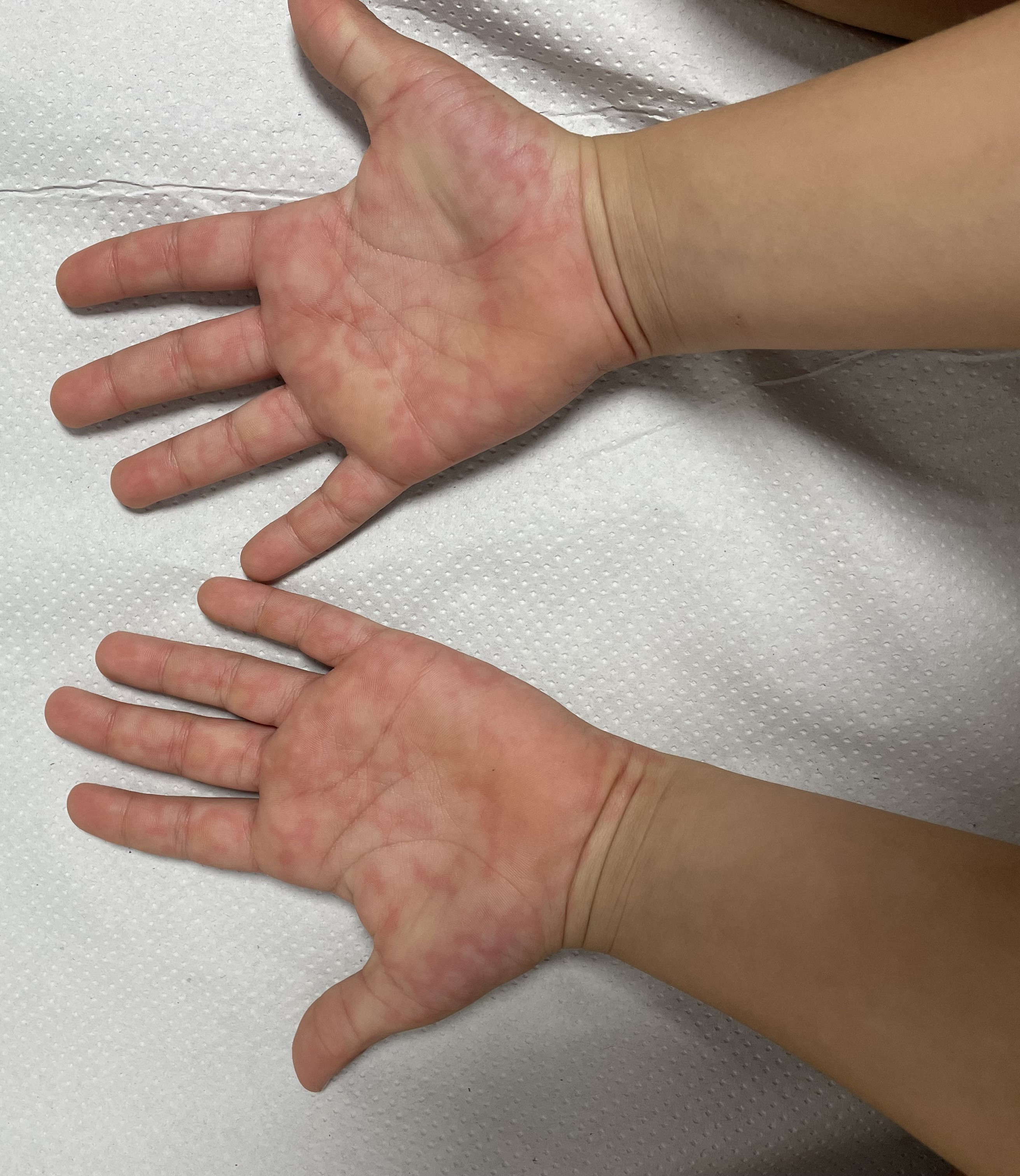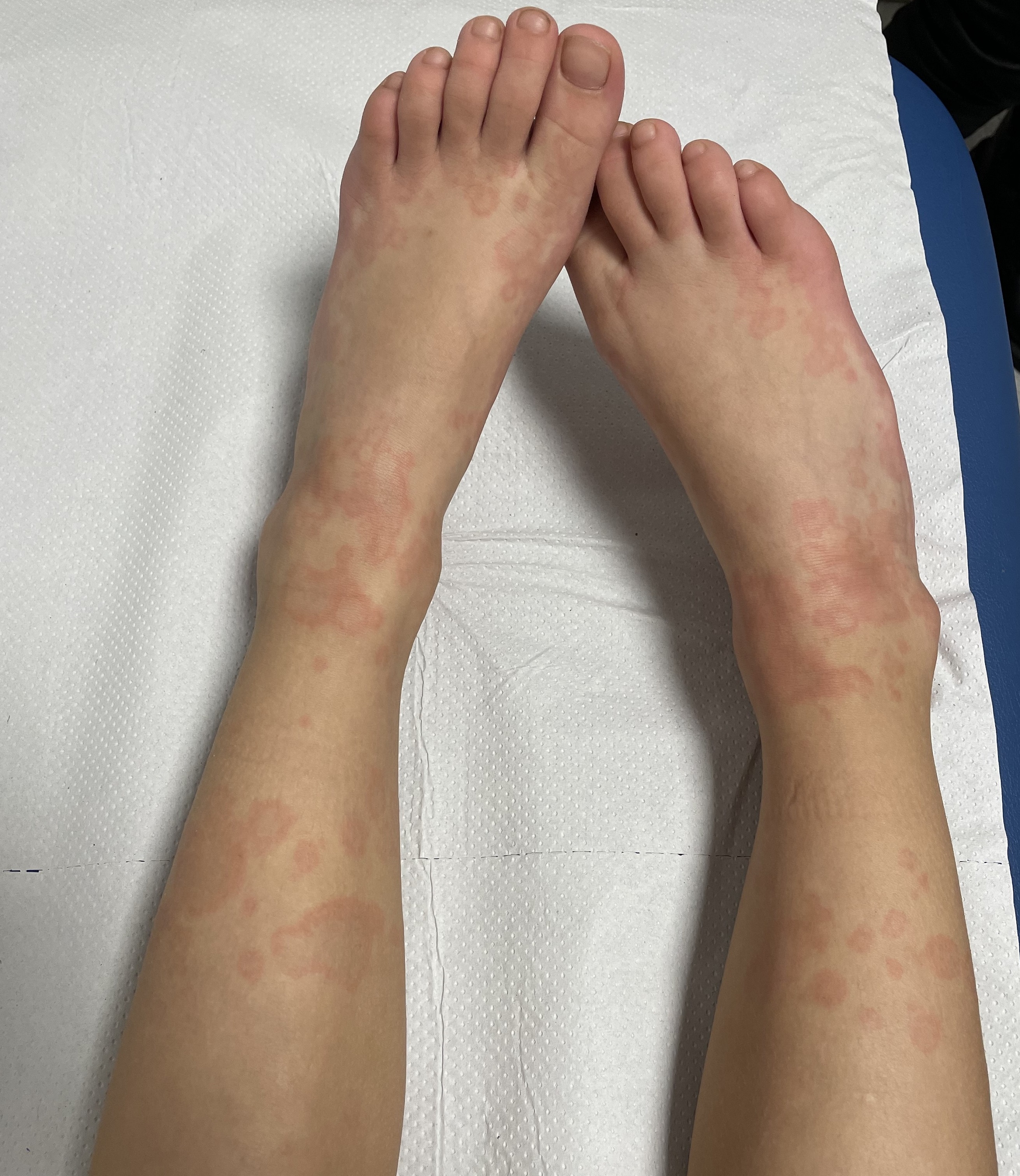 Niña de 7 años, sin antecedentes relevantes, que consulta por lesiones cutáneas de 3 días de evolución que aparecieron inicialmente en las extremidades superiores y posteriormente en las inferiores y que son ligeramente pruriginosas y no dolorosas. Al inicio asoció dolor abdominal intermitente y febrícula, autolimitados tras 24 horas. Presenta un triángulo de evaluación pediátrica estable, constantes vitales en rango para su edad y exploración física normal, salvo las lesiones (Figuras 1 y 2).