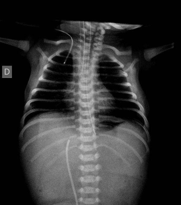 Radiografía al ingreso. Se observa imagen gástrica y total ausencia de aire distal. La sonda nasogástrica ha reducido la distensión gástrica típica de este cuadro. Se observa catéter en vena umbilical.