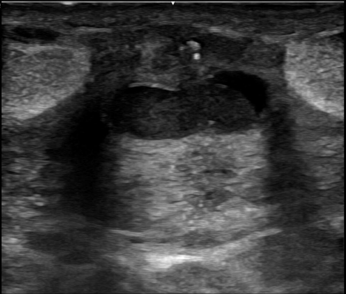A la exploración física, presenta una induración periareolar muy dolorosa a la palpación, sin que se aprecie tumoración, eritema o calor en la mama derecha. Se solicita una ecografía mamaria (Figura 1 y Figura 2).