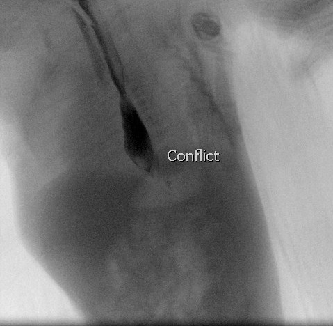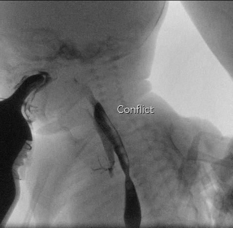 Esofagograma en el que se observa el paso de contraste a la vía respiratoria inmediatamente a la ingesta. Se observa el contraste en el bronquio principal derecho