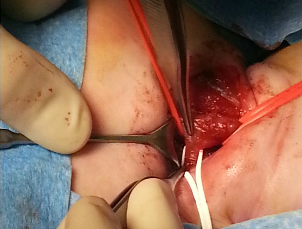 En la parte de abajo esta la tráquea y en la parte de arriba el esófago envuelto por un vaseloop; la fístula está en medio