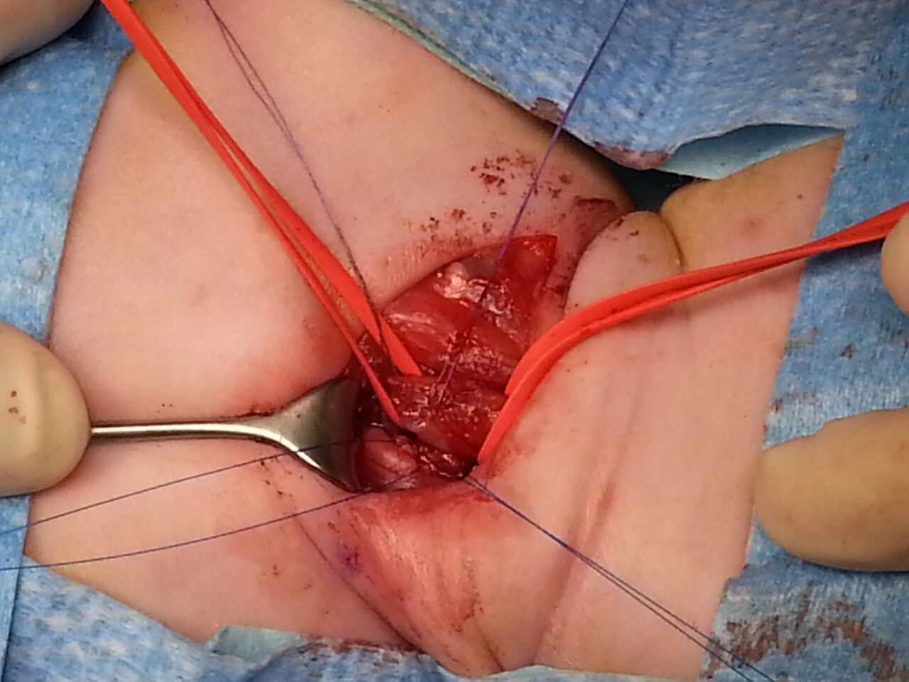 Se realiza una cervicostomía, se abre por planos, se rechaza el músculo esternocleidomastoideo y se identifica la arteria carótida, que se diseca y se rechaza lateralmente. Se identifica en ese momento el tiroides, la tráquea y el esófago. Se palpa y se pide al anestesista que movilice la guía para facilitar la identificación de estructuras. Una vez detectada la fístula, que es de 0,5 cm de diámetro, se diseca el espacio entre el esófago y la tráquea preservando en todo momento el nervio recurrente laríngeo derecho. Se liga la fístula y se cierran los defectos tanto a nivel traqueal como esofágico.