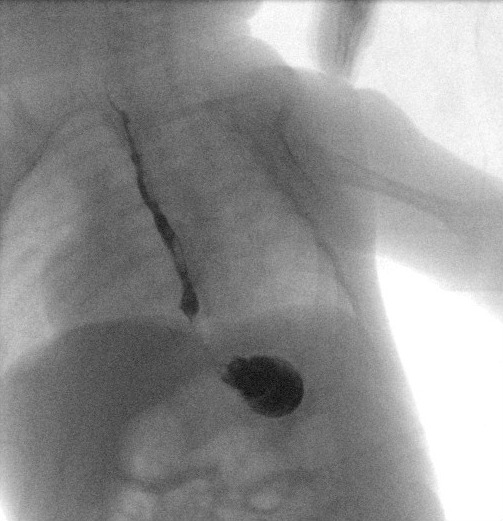 Se mantiene 48 horas con ventilación mecánica y dieta absoluta. Se realiza esofagograma de control sin observarse la fuga de contraste.