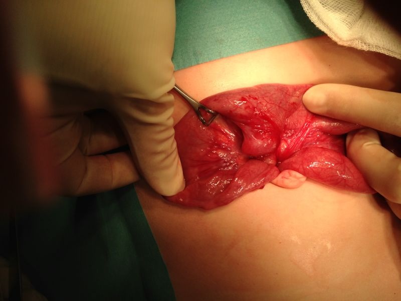 Durante la laparoscopia exploradora primero se aplican las incisiones abdominales por donde se coloraran e introducirán los trocares, se efectúa exteriorización de intestino delgado a través de la incisión supraumbilical, se realiza revisión de la cavidad peritoneal, encontrando una estructura redondeada de 2 cm, borde mesentérico de íleon terminal compatible con el diagnóstico que usted a mencionado.