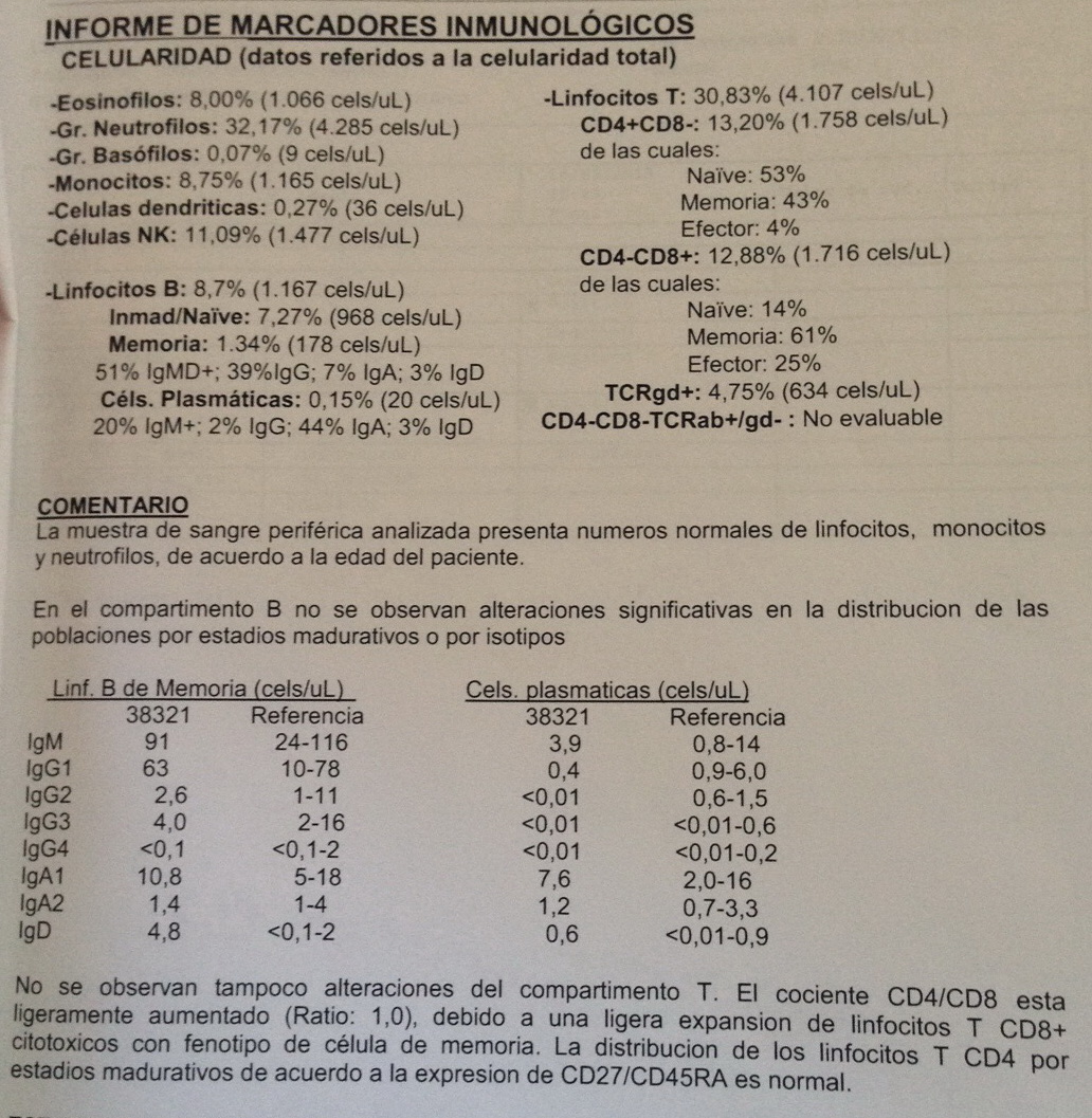 Realizamos una punción aspiración con aguja fina (PAAF) para obtener más información sobre la etiología de la adenopatía, la cual es informada como linfadenitis granulomatosa no necrotizante. Ante el resultado de la PAAF con la presencia de granulomas, se estudia la función oxidativa de los fagocitos, obteniéndose una capacidad oxidativa de neutrófilos y monocitos disminuida significativamente (10-20%). Ante este resultado nos encontrábamos ante una probable enfermedad granulomatosa crónica (ECG).