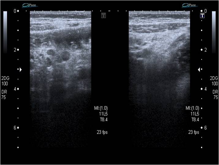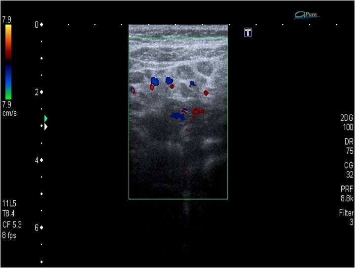 • Ecografía abdominal: hígado, vesícula y vías biliares, riñones, vía urinaria, vejiga, páncreas y bazo sin alteraciones. Las asas del intestino delgado y el colon muestran una pared de grosor normal y un discreto aumento de peristalsis. Llama la atención la hiperecogenicidad de grasa mesentérica, con múltiples y pequeñas adenopatías en su interior y un aumento de vascularización. Pequeña cantidad de líquido libre en fosa ilíaca derecha. Estos hallazgos sugieren, teniendo en cuenta información clínica, la posibilidad de enfermedad inflamatoria intestinal.