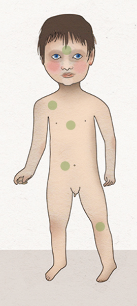 • Piel: se observan tres nódulos subcutáneos en región frontal y dos nódulos preauriculares izquierdos. Todos ellos de similares características, de color violáceo, con consistencia firme, no dolorosas y sin signos inflamatorios locales, de 1 × 1 cm de diámetro aproximado.