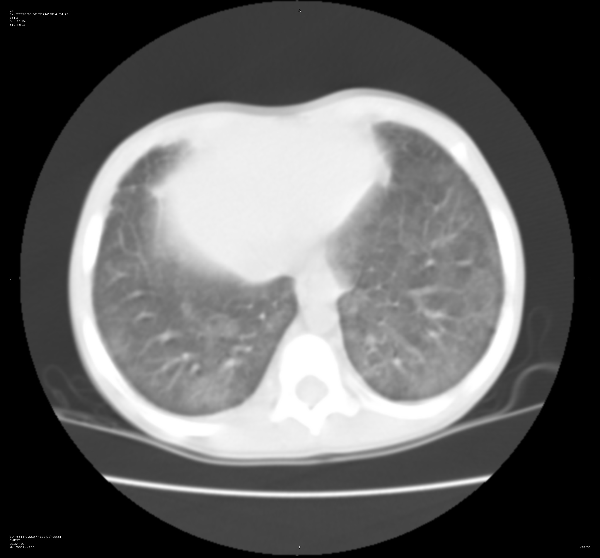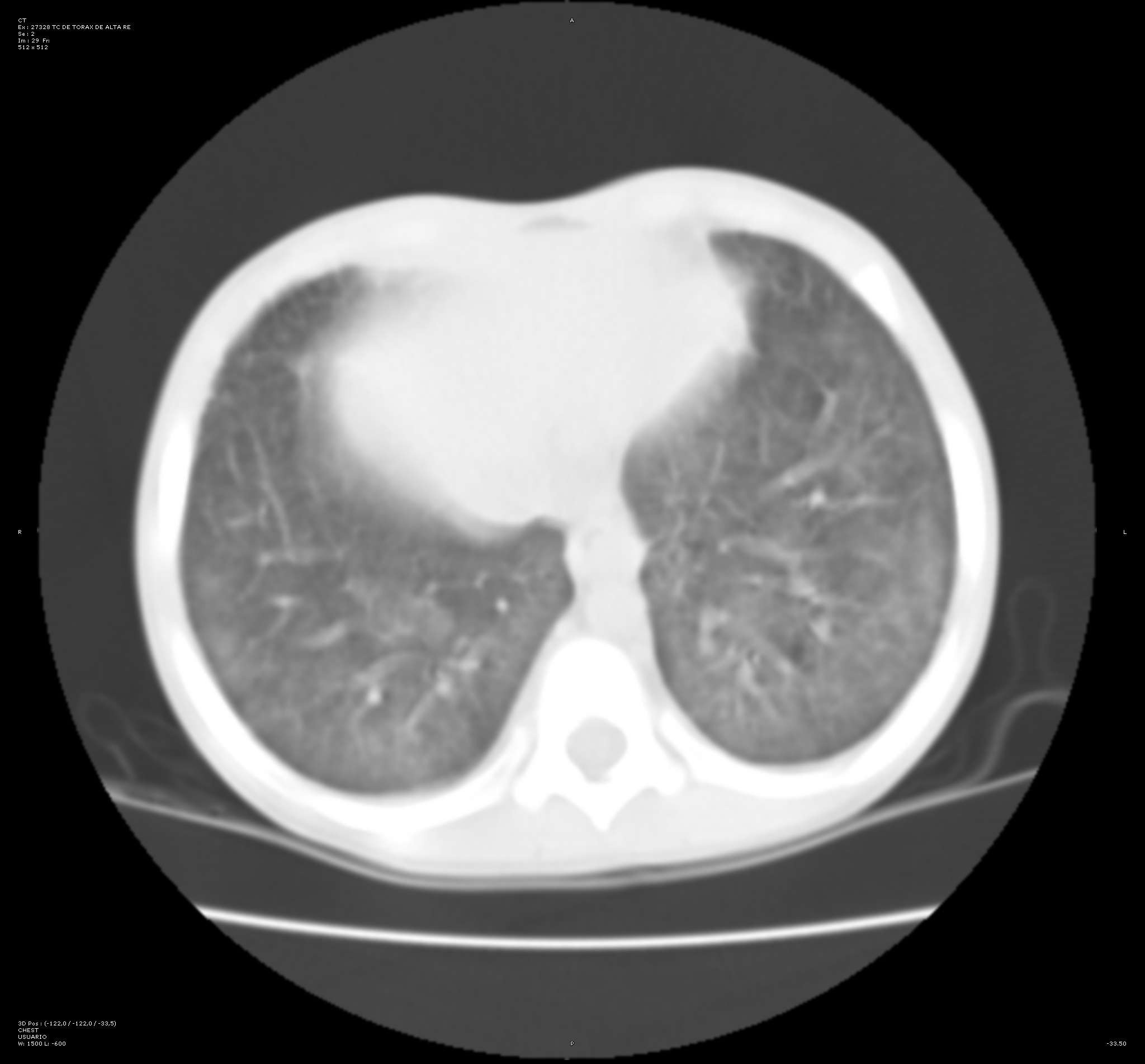 Con intención de no realizar en primer lugar una prueba invasiva que pudiera inestabilizar al paciente, se decide llevar a cabo una tomografía computarizada (TC) de tórax. En esta prueba se visualizan opacidades bilaterales parcheadas y simétricas en vidrio deslustrado de predominio en campos posteriores y basales. Este hallazgo incrementa la sospecha de hemorragia alveolar difusa.
