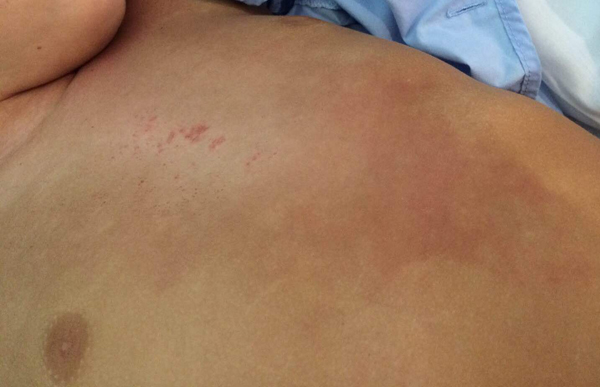Podemos observar una mejoría clara del exantema en el tórax tras el tratamiento. Disminución de la intensidad de la eritrodermia, junto con disminución del tamaño de las lesiones.