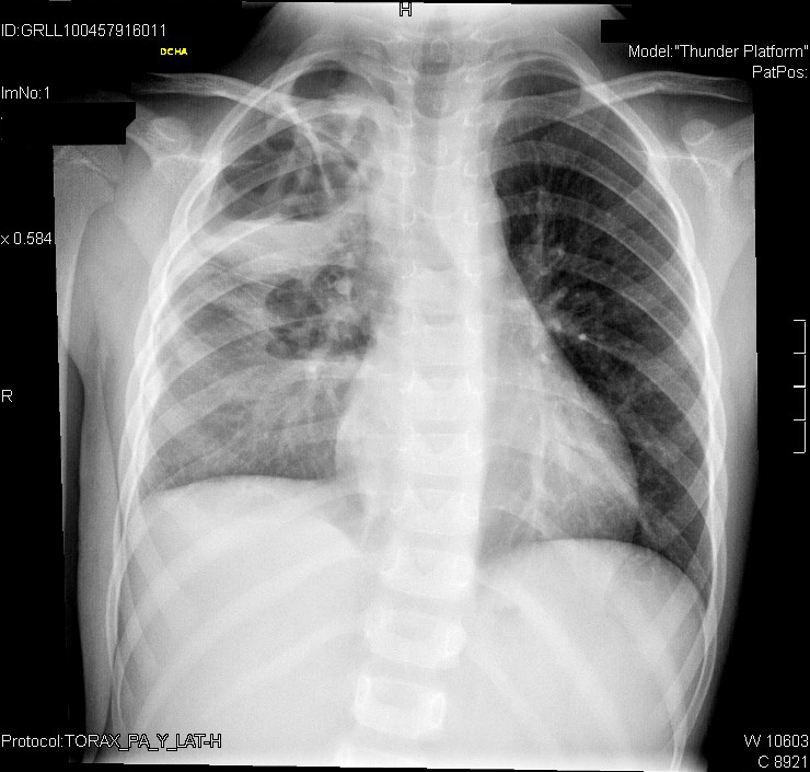 El quinto día de ingreso, que era el segundo con ampicilina a 300 mg/kg/día, nuestra paciente continúa con fiebre y excelente estado general. El drenaje del tubo pleural es escaso (< 35 ml) en las últimas 24 horas, por lo que lo retiramos. Los hemocultivos sacados al ingreso resultan negativos y la analítica en ese momento muestra 23,63 10E3/µl leucocitos y PCR de 343 mg/l.