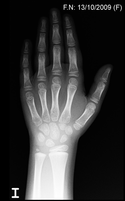 • Rx de muñeca izquierda: edad ósea de siete años (recordemos que la edad cronológica es de cinco años y diez meses).