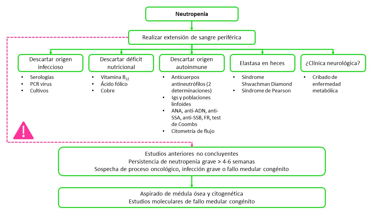2. Revisar la extensión de sangre periférica, confirmar que la neutropenia no es transitoria y valorar si es cíclica (realización de hemogramas seriados).