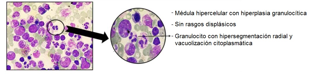 En esta patología encontramos por un lado una alteración en la liberación de neutrófilos maduros, los cuales quedan retenidos en la médula ósea (MO) creando un patrón característico, y por otro, un aumento de los fenómenos apoptóticos. Así, se caracteriza por la presencia de una médula ósea hipercelular con hiperplasia de la serie granulocítica, observando numerosos neutrófilos maduros con vacuolas citoplasmáticas, hipersegmentación y lóbulos nucleares conectados mediante filamentos finos de cromatina.