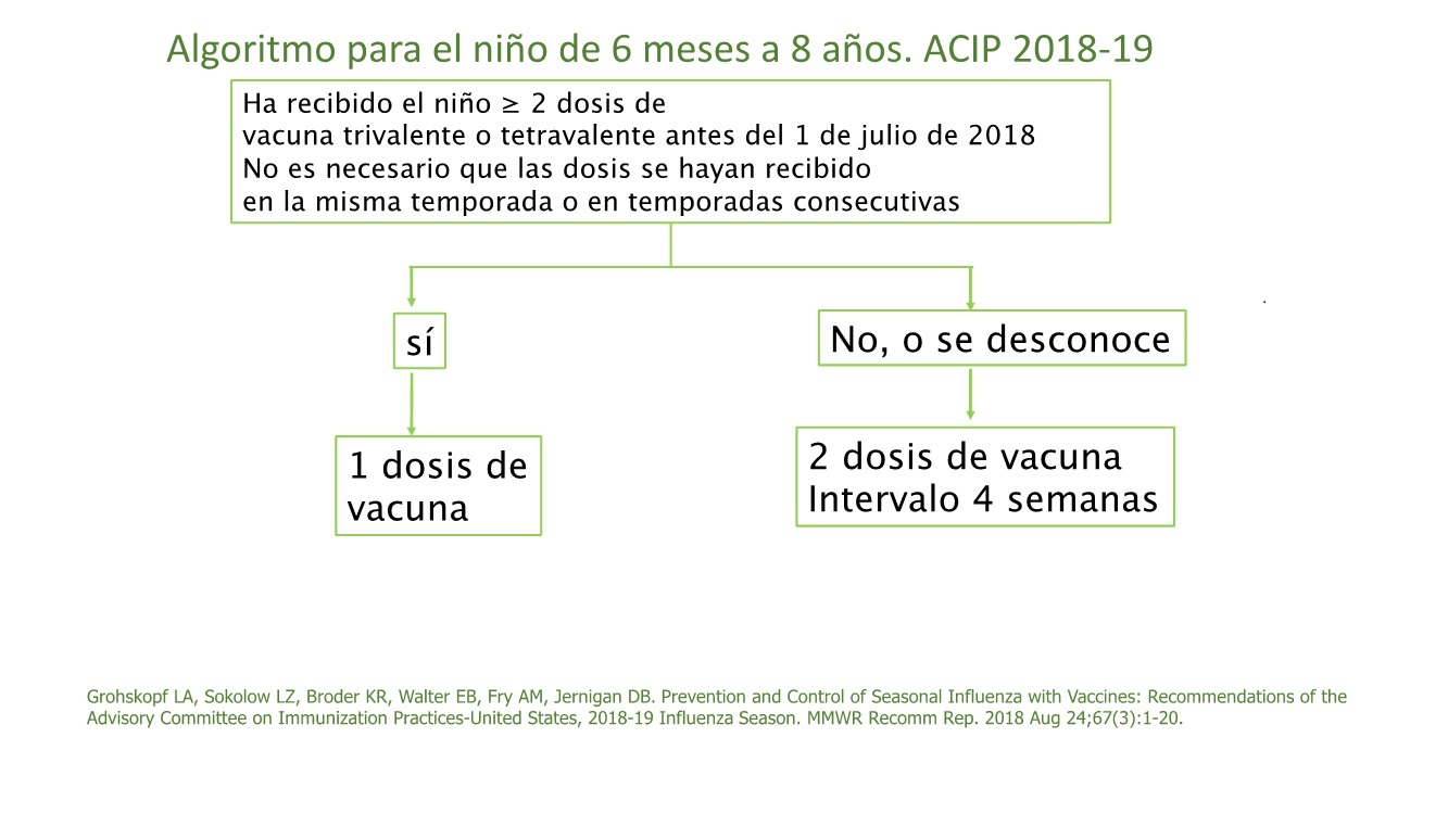 El primer año que se vacunan necesitan dos dosis separadas, al menos, por un intervalo de 4 semanas. Si el paciente ha recibido, al menos, dos dosis de vacuna en temporadas previas (no es necesario que se hayan administrado en la misma temporada o en temporadas sucesivas), solo precisa una dosis10,11. En este enlace puede consultar un algoritmo de actuación.