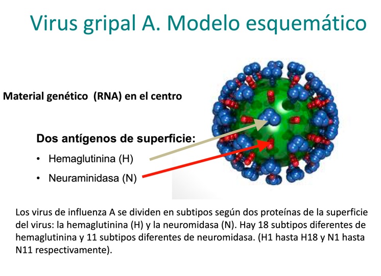 En la imagen de un virus gripal tipo A se puede ver que disponen de unas proteínas de superficie que son importantes para la clasificación y la respuesta inmunitaria, la hemaglutinina (H) y la neuraminidasa (N).