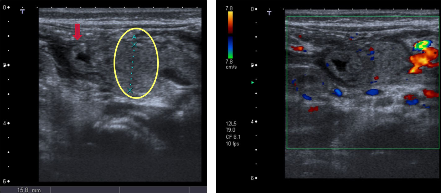 Se identifica un aumento del tamaño del páncreas de forma difusa pero más acentuada en la región de la cabeza pancreática (círculo), que presenta una morfología redondeada y globulosa, con una ecogenicidad discretamente heterogénea y unas medidas aproximadas de 18 × 18 mm. No se identifica dilatación del conducto de Wirsung. También se identifica un engrosamiento parietal difuso del duodeno (flecha) (4,3 mm de espesor).