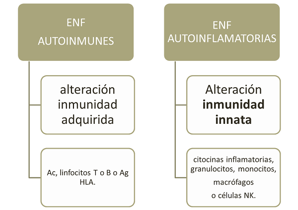 Las enfermedades autoinflamatorias son entidades causadas por mutaciones genéticas que alteran la respuesta inmunitaria innata, lo que las diferencia de las enfermedades autoinmunes, donde se produce una desregulación de la inmunidad adquirida.