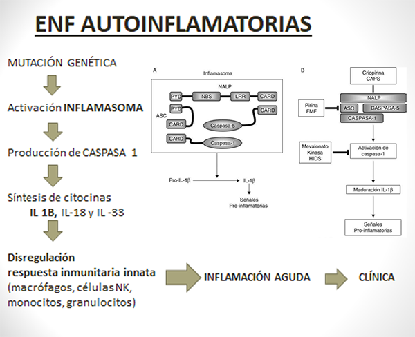 Su etiopatogenia se basa en la activación de los inflamosomas, complejo multiproteico del citosol celular. Esto da lugar a la producción de caspasa 1, enzima encargada de la síntesis de citoquinas IL-1β, IL-18 e IL-33, causantes de alterar la función de células de inmunidad innata (macrófagos, monocitos, granulocitos, células natural killer…). Todo ello dará lugar a un proceso de inflamación aguda, responsable de los síntomas y signos de estas enfermedades.