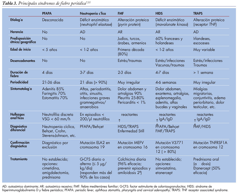 En el caso de nuestro paciente, el primer diagnóstico realizado fue clínico, al cumplir algunos de los criterios clínicos propuestos para esta enfermedad, como los episodios de síntomas inflamatorios con duración superior a 5 días y recurrentes con periodos asintomáticos inferiores a 9 meses.