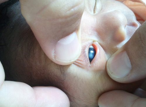 Deben explorarse los globos oculares y su tamaño (descartar anoftalmia, microftalmia o buftalmos), el iris (descartar anhiridia o coloboma) y la transparencia (descartar leucocoria). Las pupilas han de ser simétricas y reactivas. Las hemorragias conjuntivales pericorneales, así como las petequias, son frecuentes tras el parto y se resuelven espontáneamente.