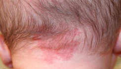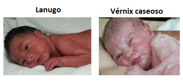 Al nacer, la piel está cubierta por el vérnix caseoso, útil para la protección contra las infecciones por su acción bactericida y como nutriente. También presenta lanugo, vello muy fino sobre los hombros y el dorso. En la cabeza, en el occipucio y la cara, se pueden observan pequeños angiomas planos.