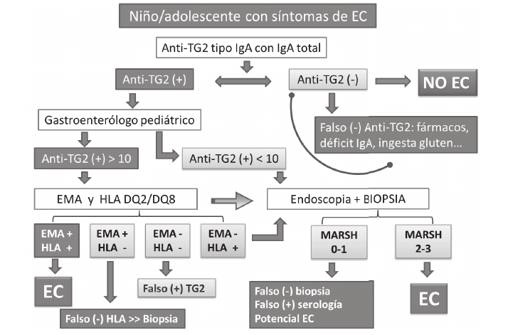 Según las últimas recomendaciones de la Sociedad Europea de Gastroenterología, Hepatología y Nutrición Pediátrica (ESPGHAN), la biopsia intestinal se puede omitir en niños y adolescentes con todos los siguientes criterios: