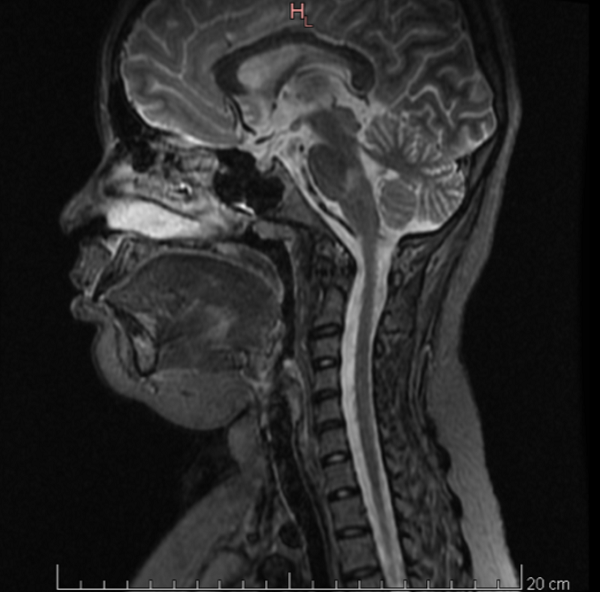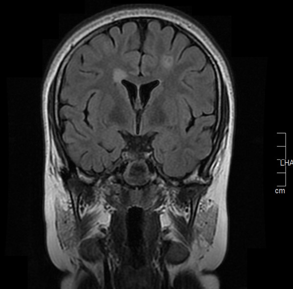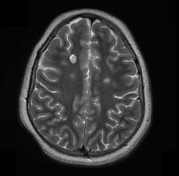 Se realiza una RM craneomedular. El estudio cerebral pone de manifiesto múltiples lesiones focales (aproximadamente 25, de entre 5 y 20 mm) predominantemente hiperintensas en secuencias T2. Afectan a la sustancia blanca yuxtasubcortical y periventricular de ambos hemisferios cerebrales, incluyendo el cuerpo calloso y el troncoencéfalo. Múltiples de las lesiones supratentoriales muestran una señal de resonancia heterogénea tanto en las secuencias T1 como T2, con un patrón interno en anillos concéntricos (patrón tipo Balo).